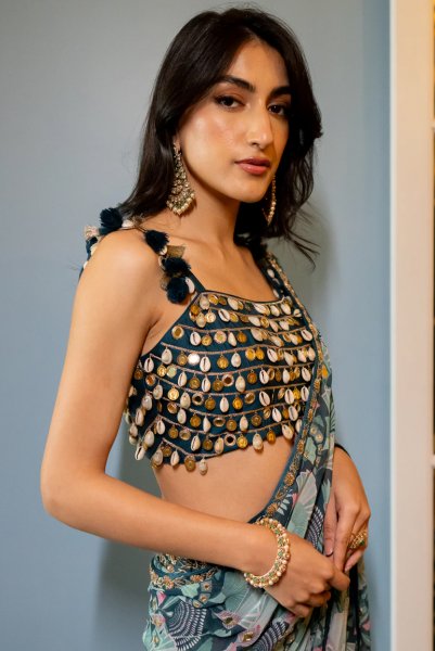 Silver Mirror Work Stitched Saree