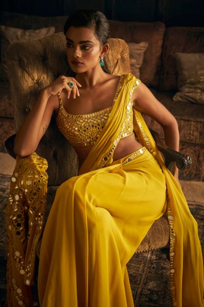Yellow Mirror Work Stitched Saree
