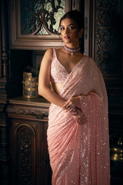 Pink Sequin Georgette Saree