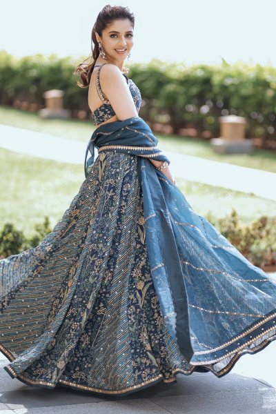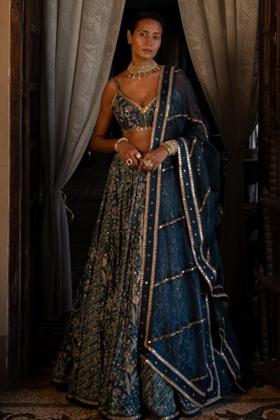 Featuring a navy blue embroidered lehenga set in our signature combination delicate prints paired with a tissue dupatta with antique gold hand embroidery.