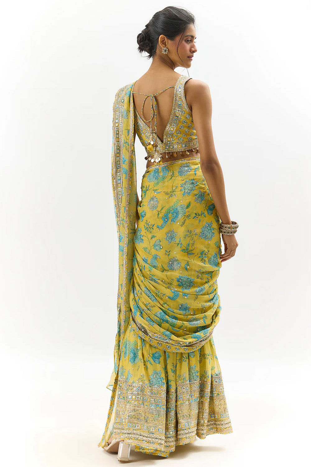 The saree features a pre-pleated silhouette with a voluminous flair and a stunning mirror and sequin embroidered border that adds a festive sparkle. Paired with a blouse intricately embellished and with delicate detailing, the look is sophisticated, modern, and ready to wear.