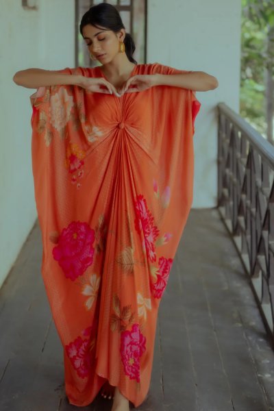 An anar and rose placement print kaftan in sherbet orange, with delicate knot detailing in the front. Perfect for a leisurely vacation.