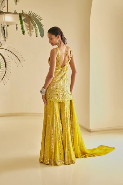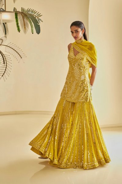 This yellow georgette sharara set features all over mirror work and is paired with a four sided embroidered dupatta.